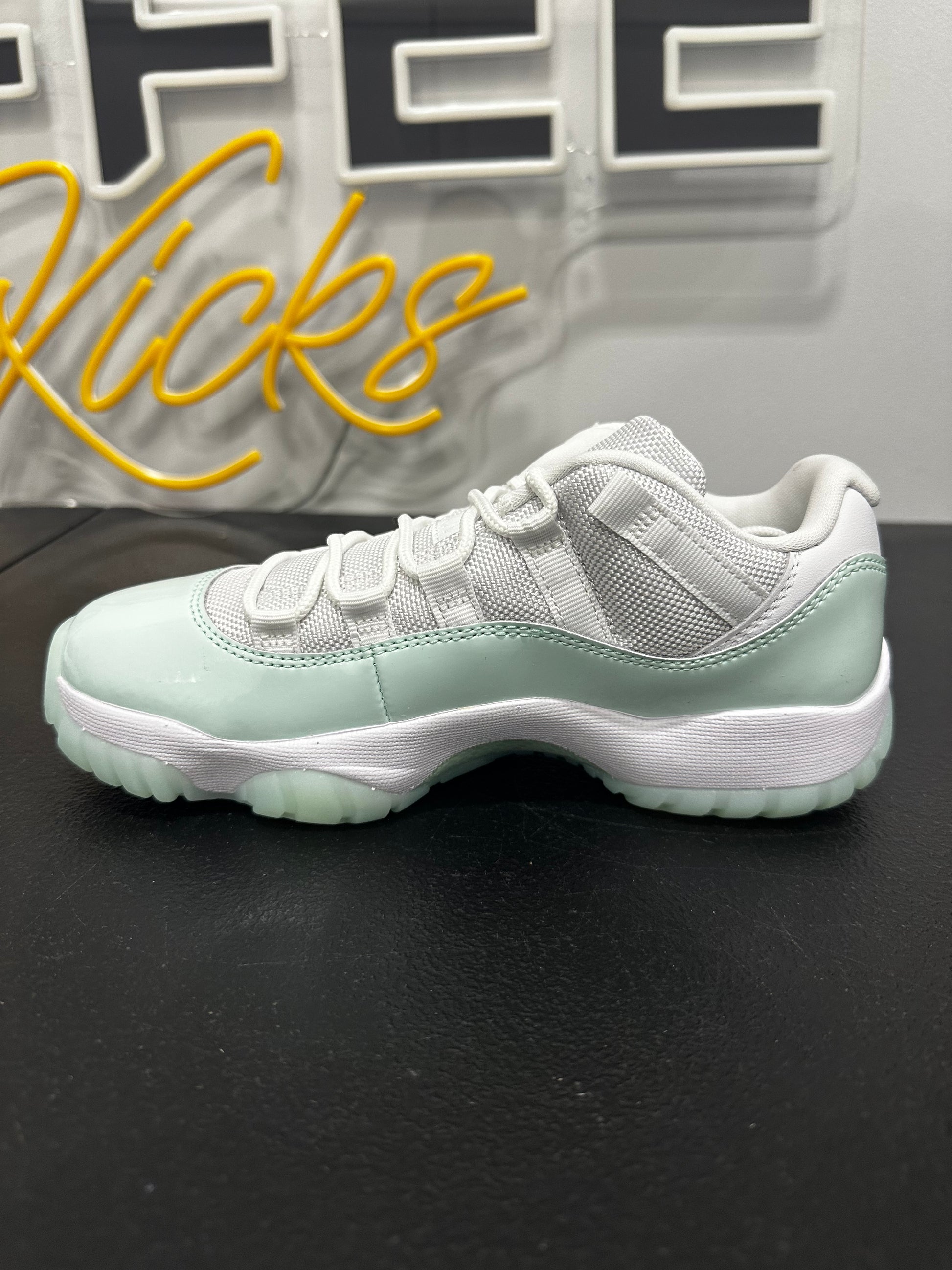 The Women's Air Jordan 11 Retro Low 'Igloo' features a white ballistic mesh upper with a shiny patent leather mudguard in a soft mint green hue. The low-top is mounted on a white Phylon midsole with full-length Air-sole cushioning. Underfoot, the translucent rubber outsole utilizes herringbone traction pods for optimal grip.