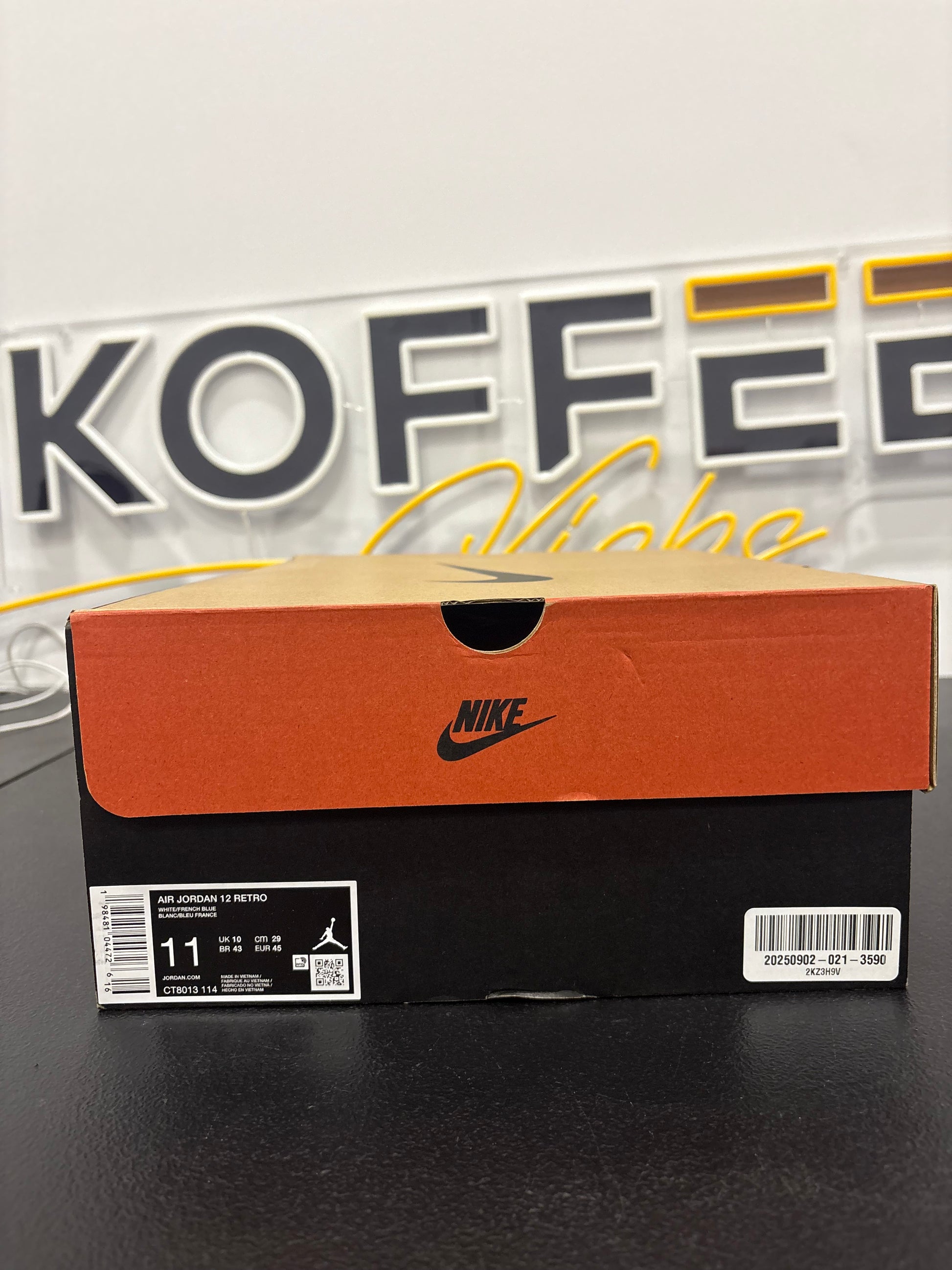 The 2025 edition of the Air Jordan 12 Retro 'French Blue' revives a 2004 release, featuring a white tumbled leather upper with radiating stitch lines and a blue lizard-textured overlay. Jumpman branding adorns the tongue and heel loop. The Phylon midsole packs a full-length Zoom Air unit for responsive cushioning. Underfoot, the blue rubber outsole features herringbone traction pods and an exposed carbon fiber shank.