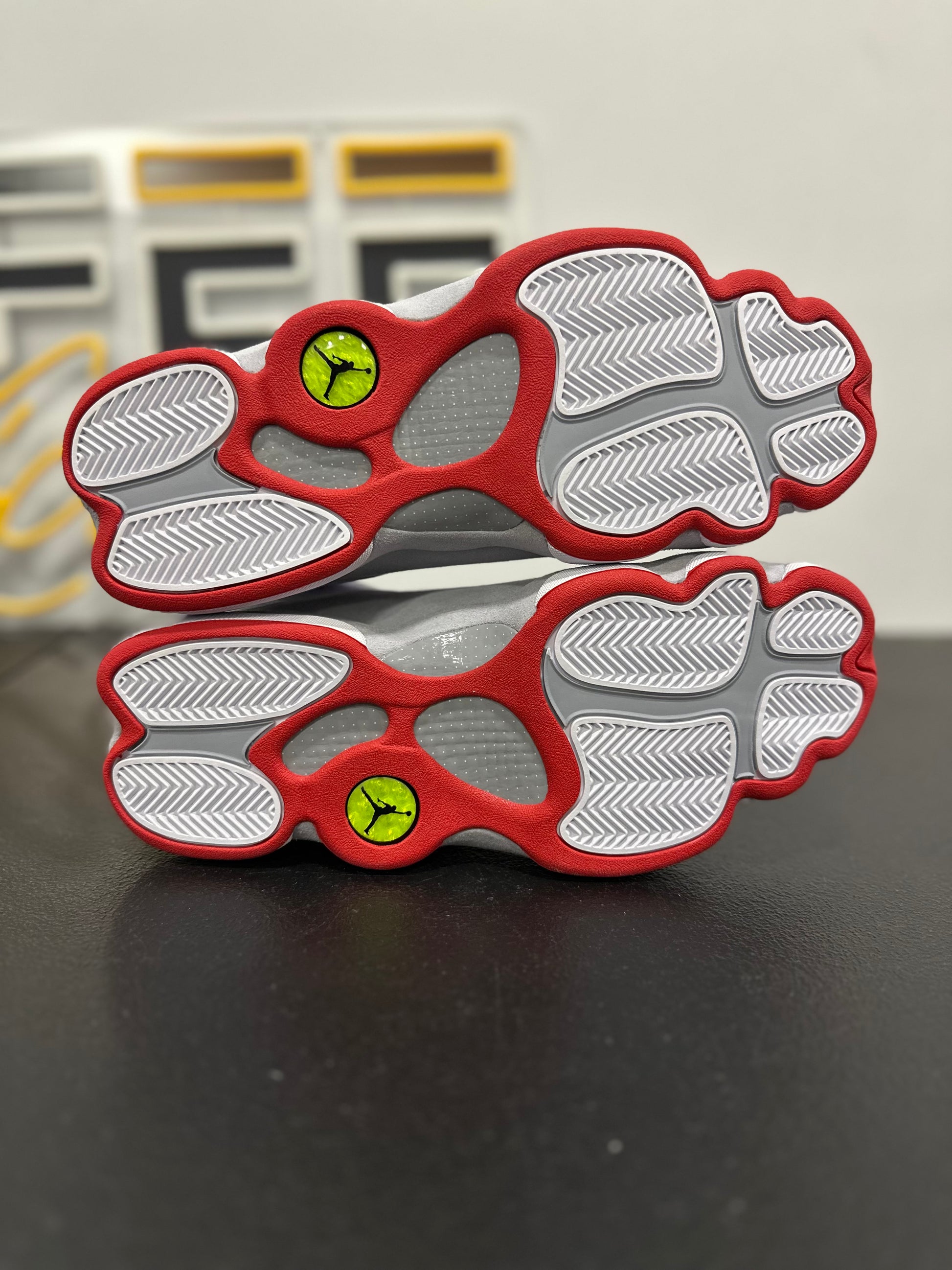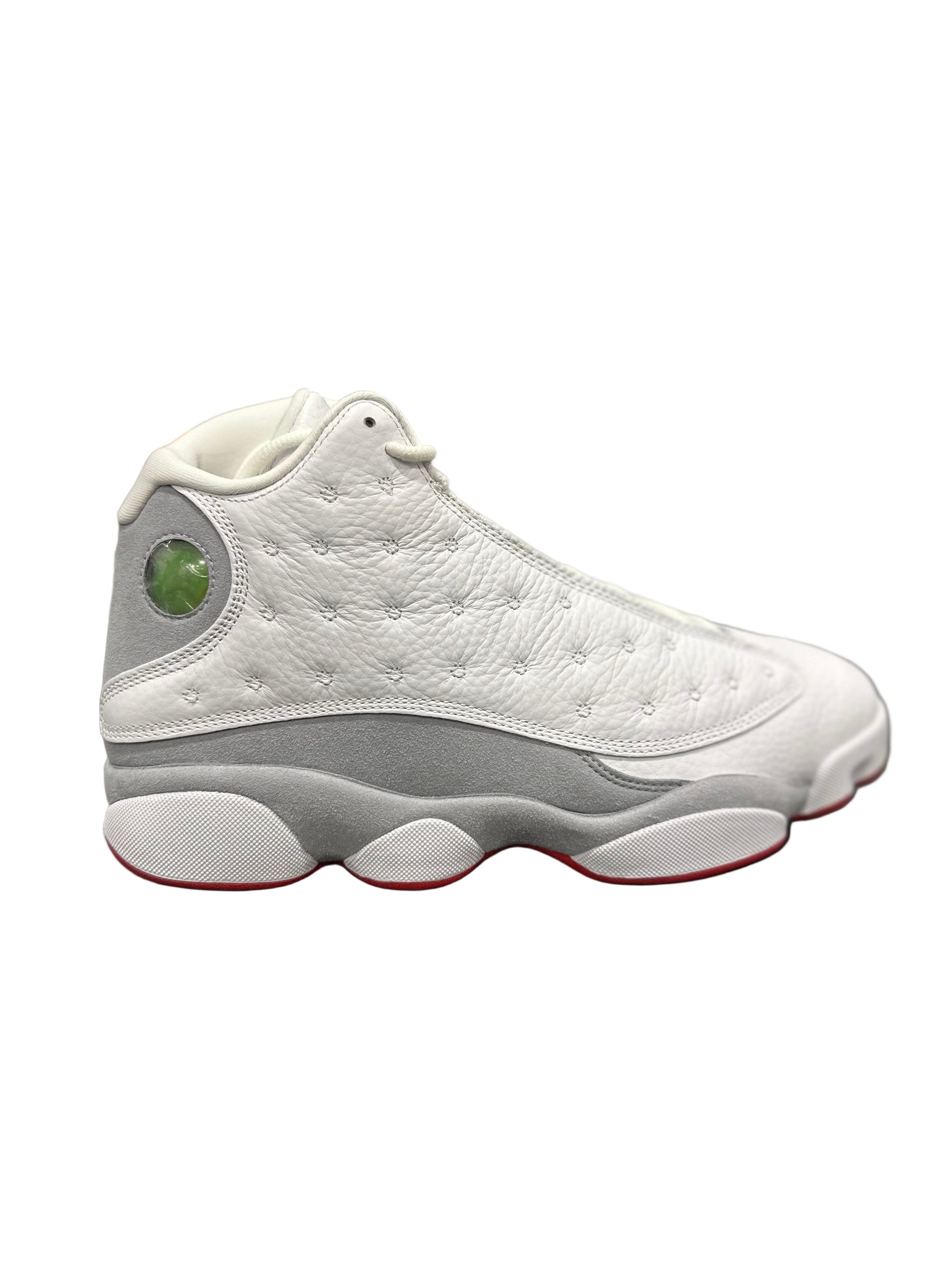 The Retro Jordan 13 in Wolf Gray has a clean white leather base with small perforations in the shape of a circle for a unique look. Wolf Gray overlays adorn the heel and the midsole just above the sole of the shoe. It features a vibrant red color underfoot, and the Jordan Jumpman logo appears in the same red shade on the tongue. Branding details are completed with the signature Jordan hologram on the back.