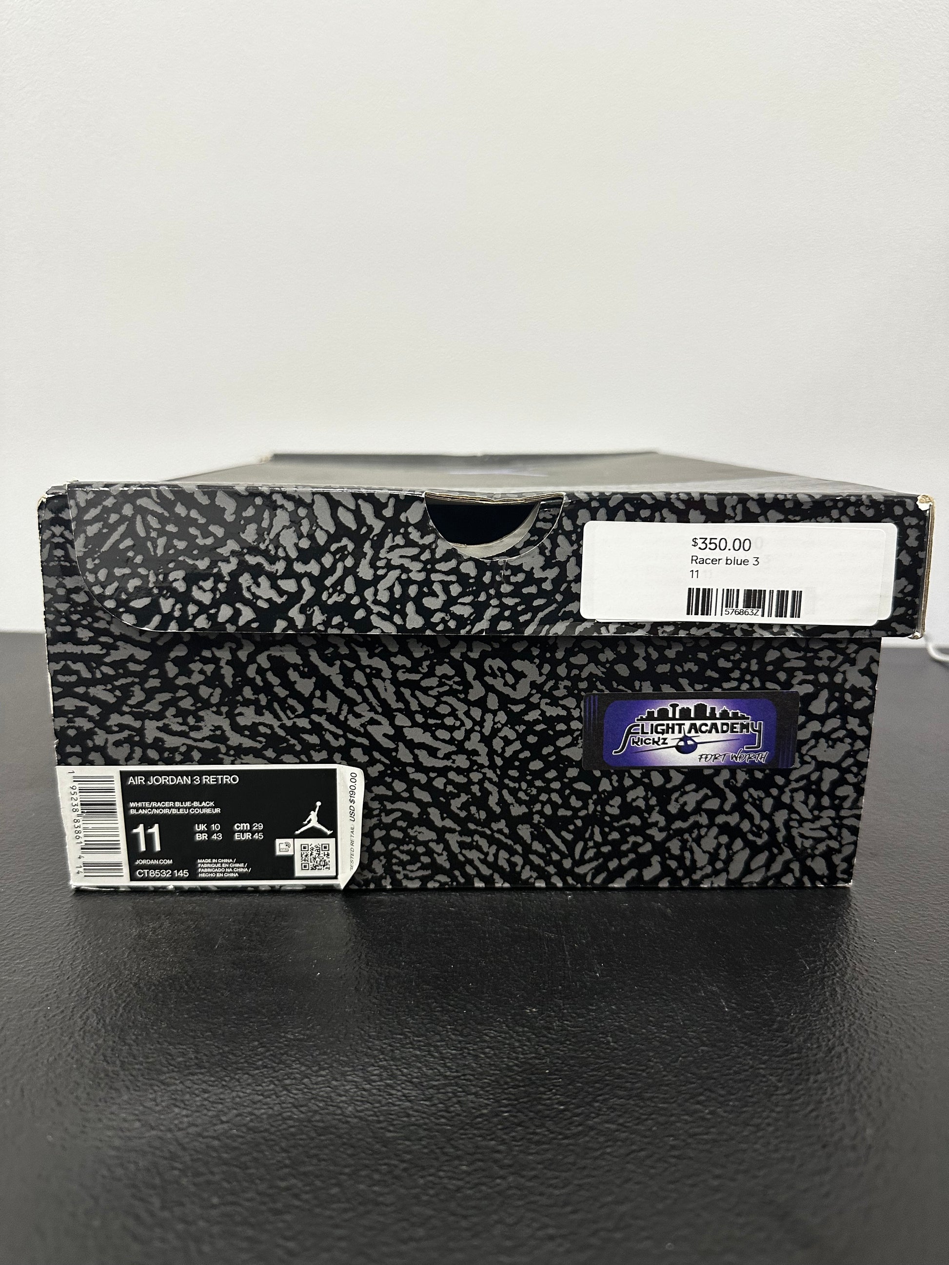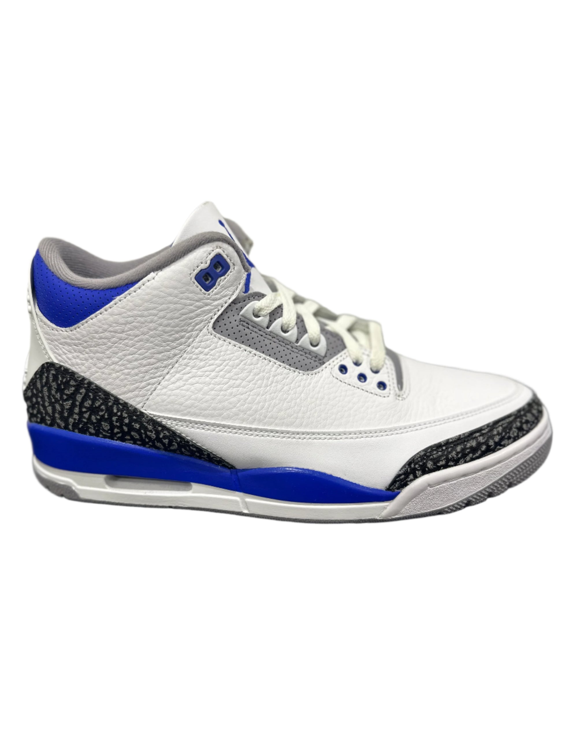 The Air Jordan 3 Racer Blue features a white tumbled leather upper with grey perforated leather eyestays and Cement overlays. From there, hits of Racer Blue on the Jumpman logos and midsole add vibrance to the classic model.