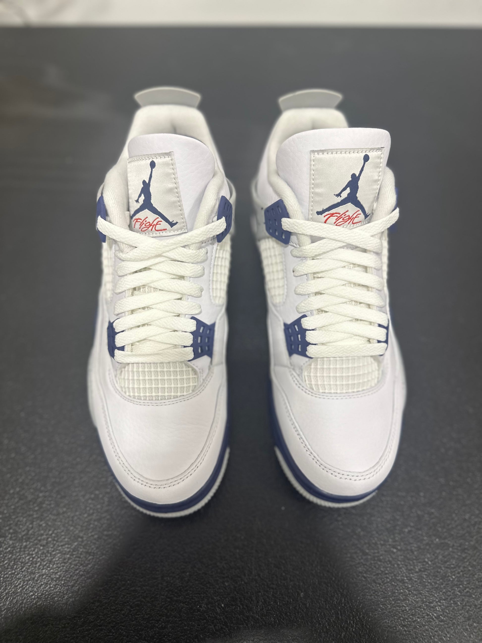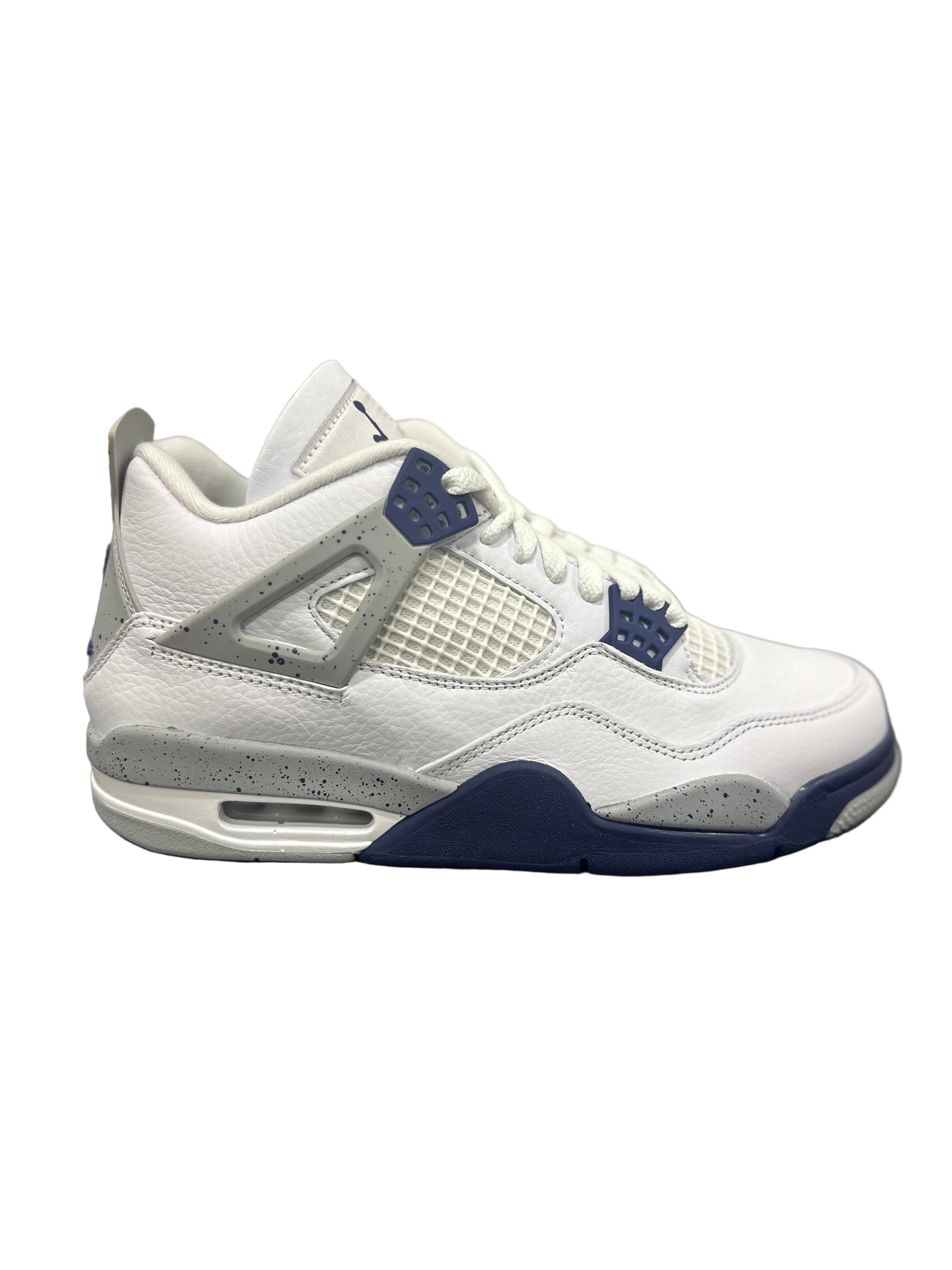 The Air Jordan 4 Retro White Midnight Navy dresses in white, midnight navy, and light smoke grey colorway.