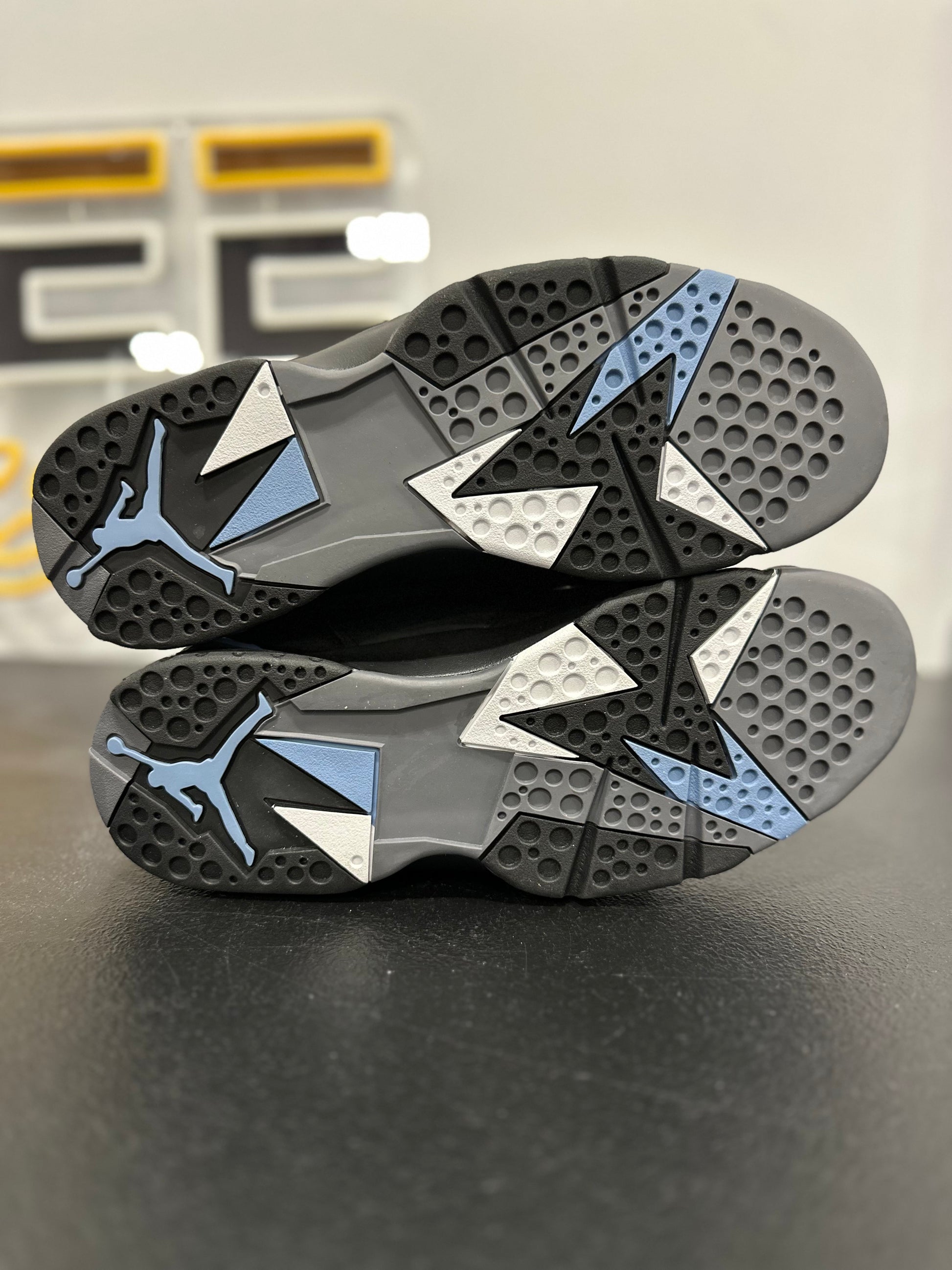 The Chambray Air Jordan 7 2023 is equipped with a cushioned foam midsole that provides both comfort and support. The outsole of the sneaker is made with durable rubber that provides traction and is designed to withstand the rigors of regular usage. The Jumpman logo appears on the side, and the Air Jordan branding is on the tongue.
