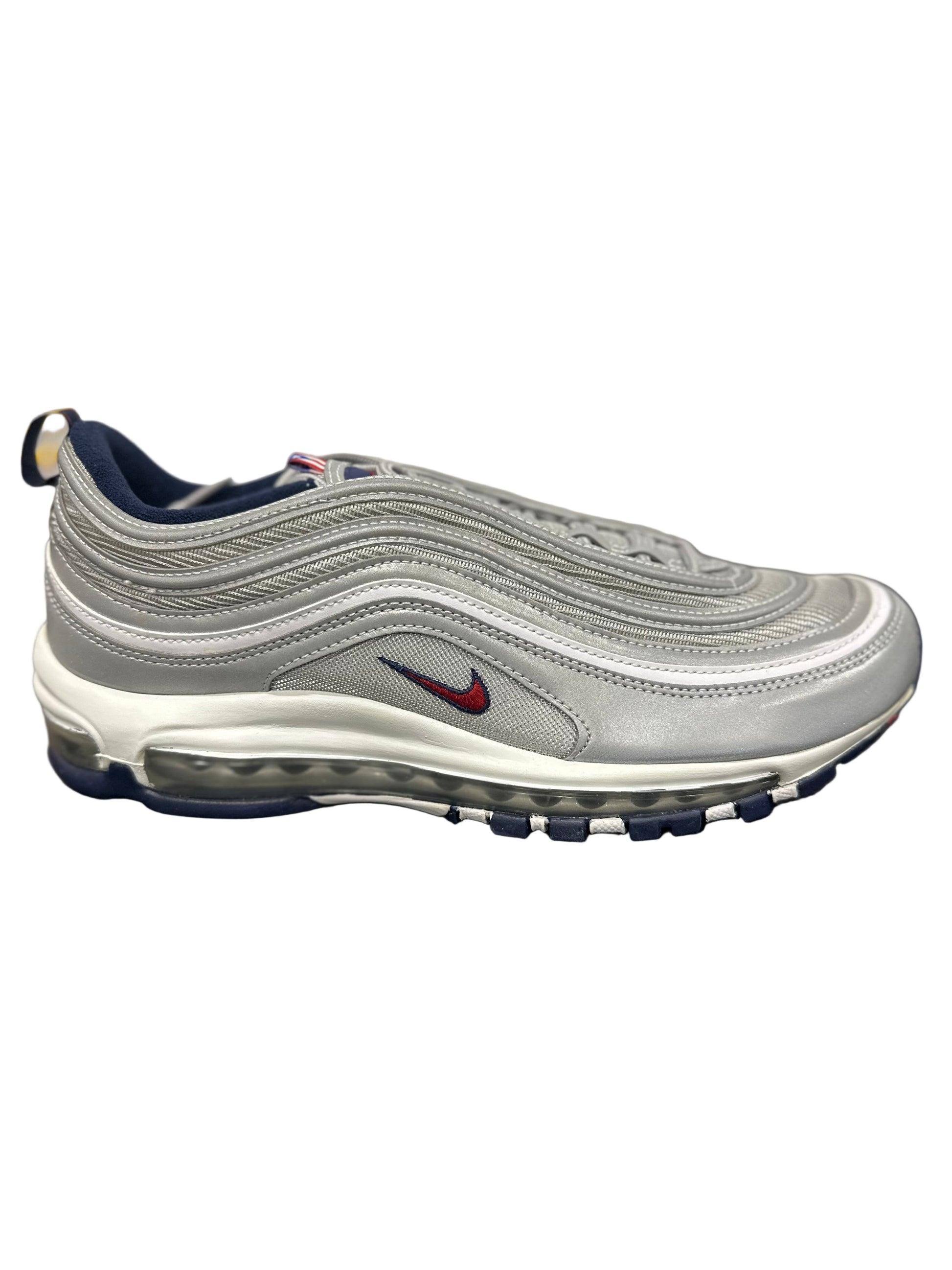 The Nike Air Max 97 Puerto Rico features a silver mesh and reflective upper with a red and navy embroidered Swoosh on the lateral side. Puerto Rican flags on the tongue loops and outsoles complete the design.