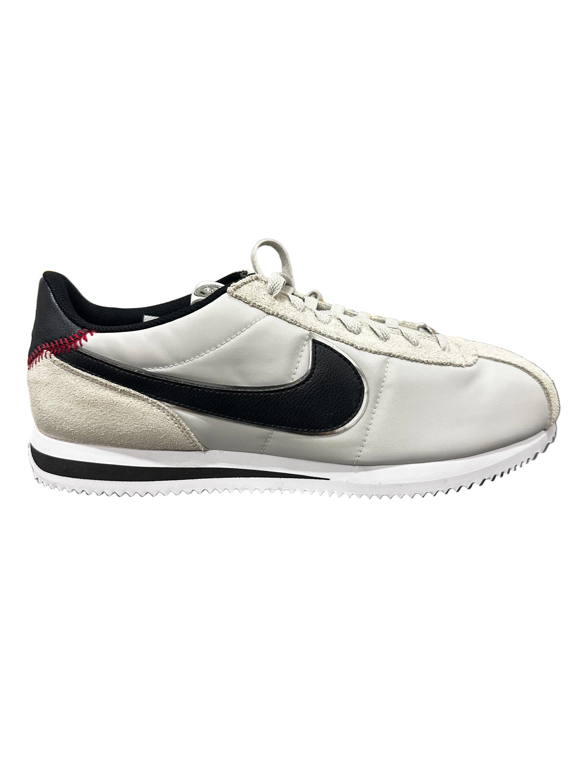 The Nike Cortez TXT Jackie Robinson Day is a low top vintage style athletic shoe with a Photon Dust leather upper that presents the Nike Swoosh on the sides in Black with a Metallic Silver outline. The Swoosh coordinates with Black midsole detailing and rear heel tabs that display 4 on the left and 2 on the right, outlined in Gym Red baseball stitching. The Metallic Silver tongue branding and dubrae complete the aesthetic.