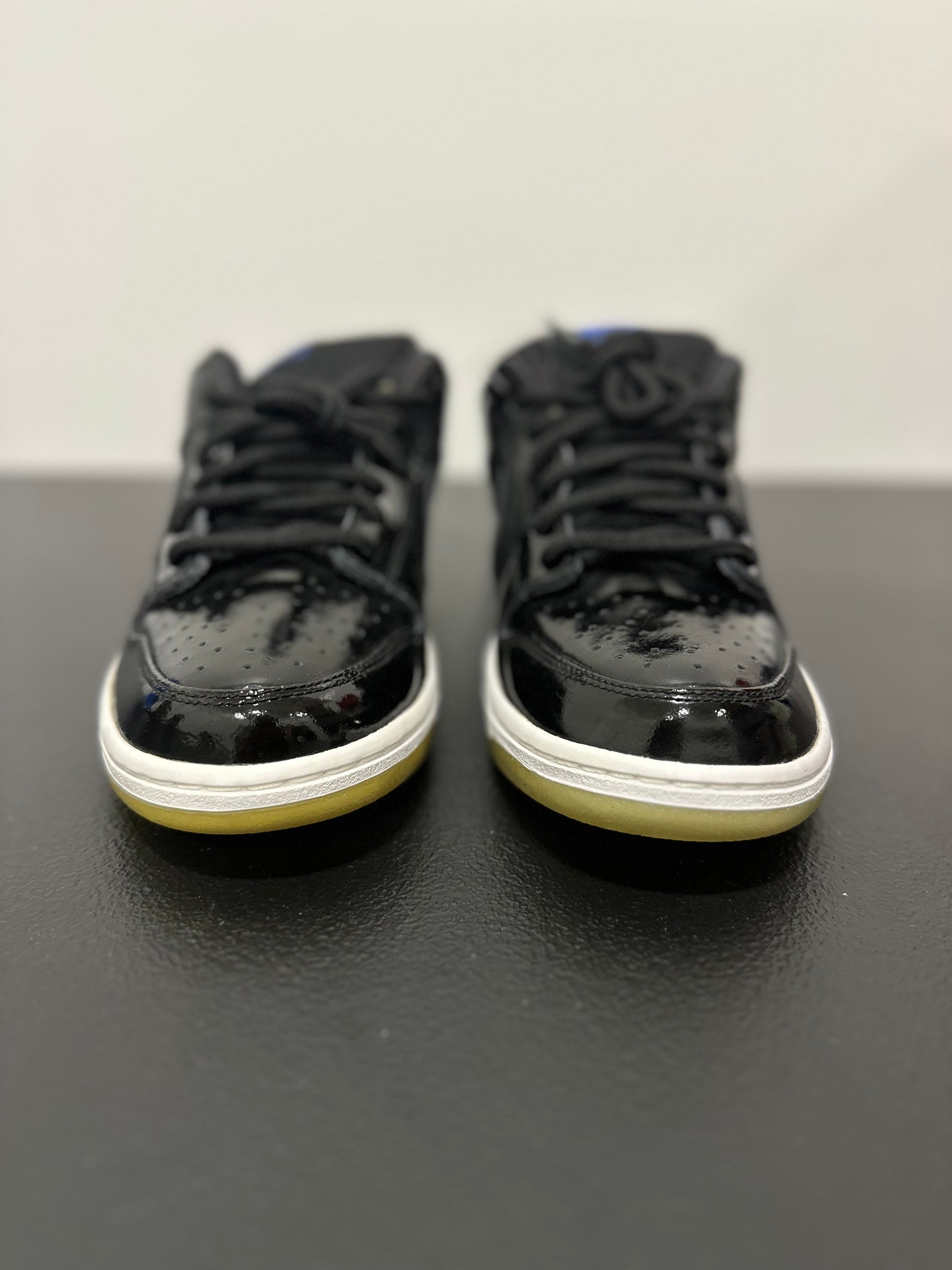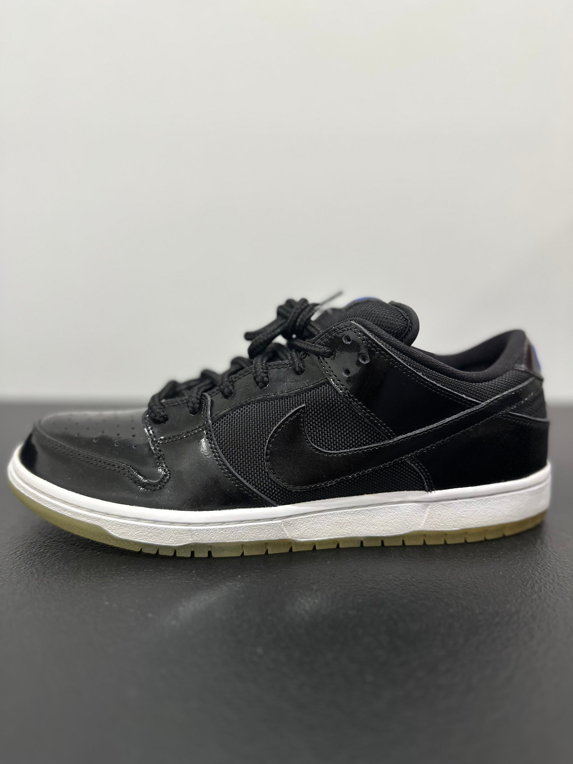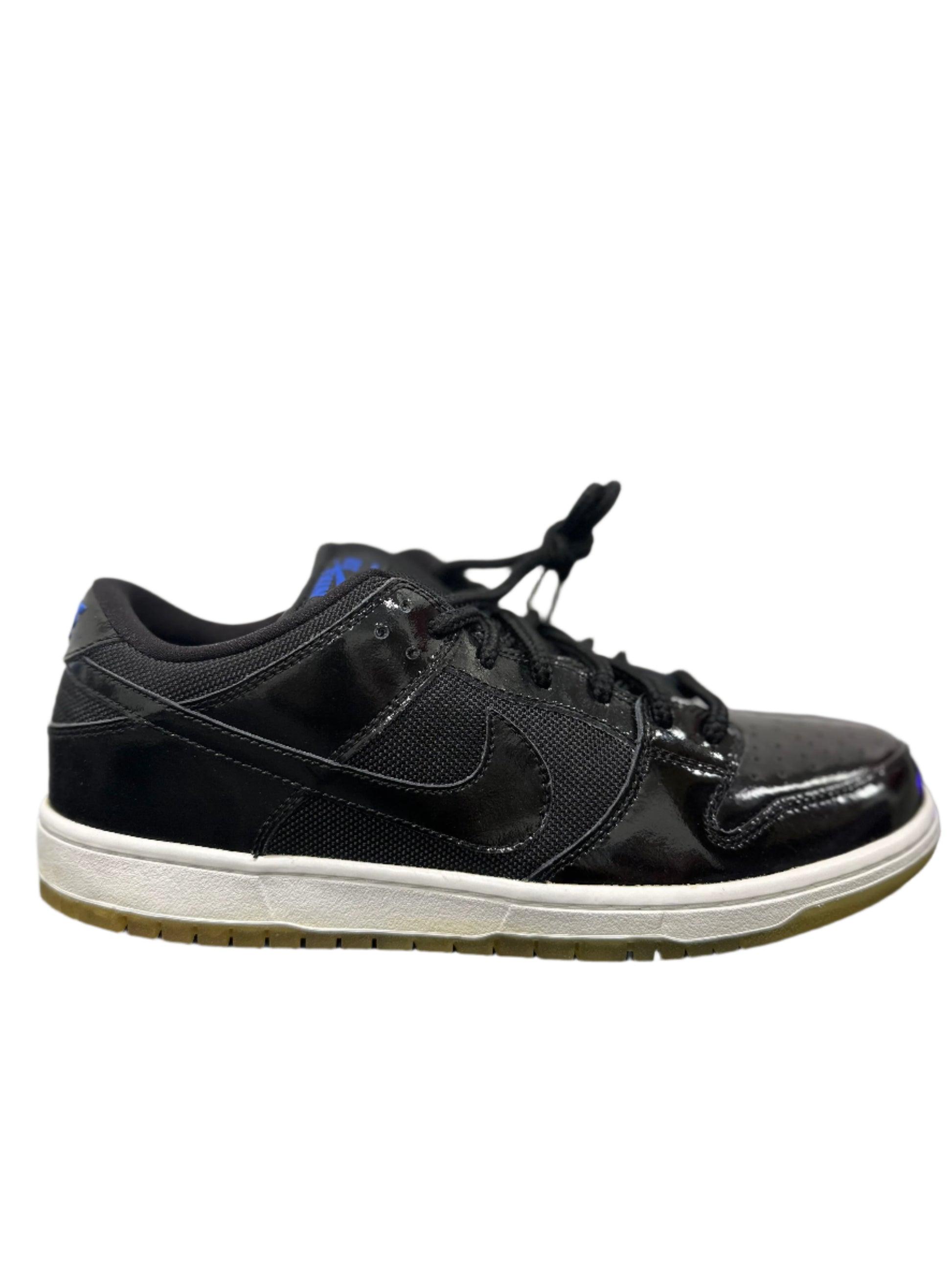 Taking inspiration from the classic Air Jordan 11, Nike SB translates an iconic high-top basketball shoe into the Dunk Low Pro SB 'Space Jam'—a low top skate shoe with patent leather and mesh textiles. Released in Summer 2011, the classic colorway features an all-black patent leather and mesh upper with bright blue branding embroidered at the tongue and heel panel. The sneaker is finished with a contrasting white midsole with a translucent outsole.