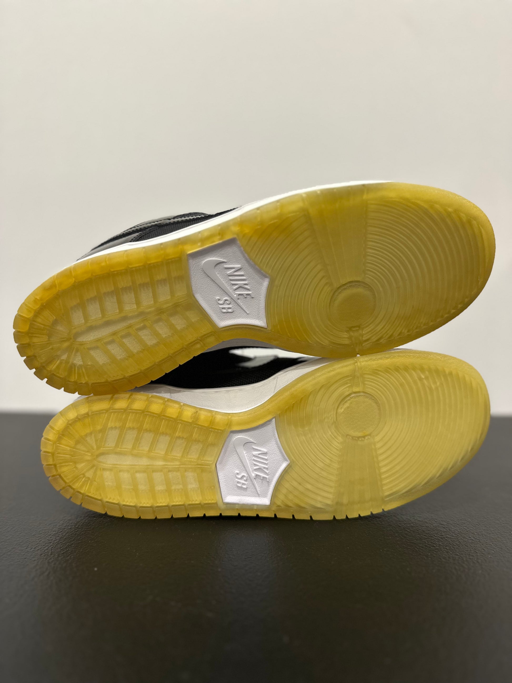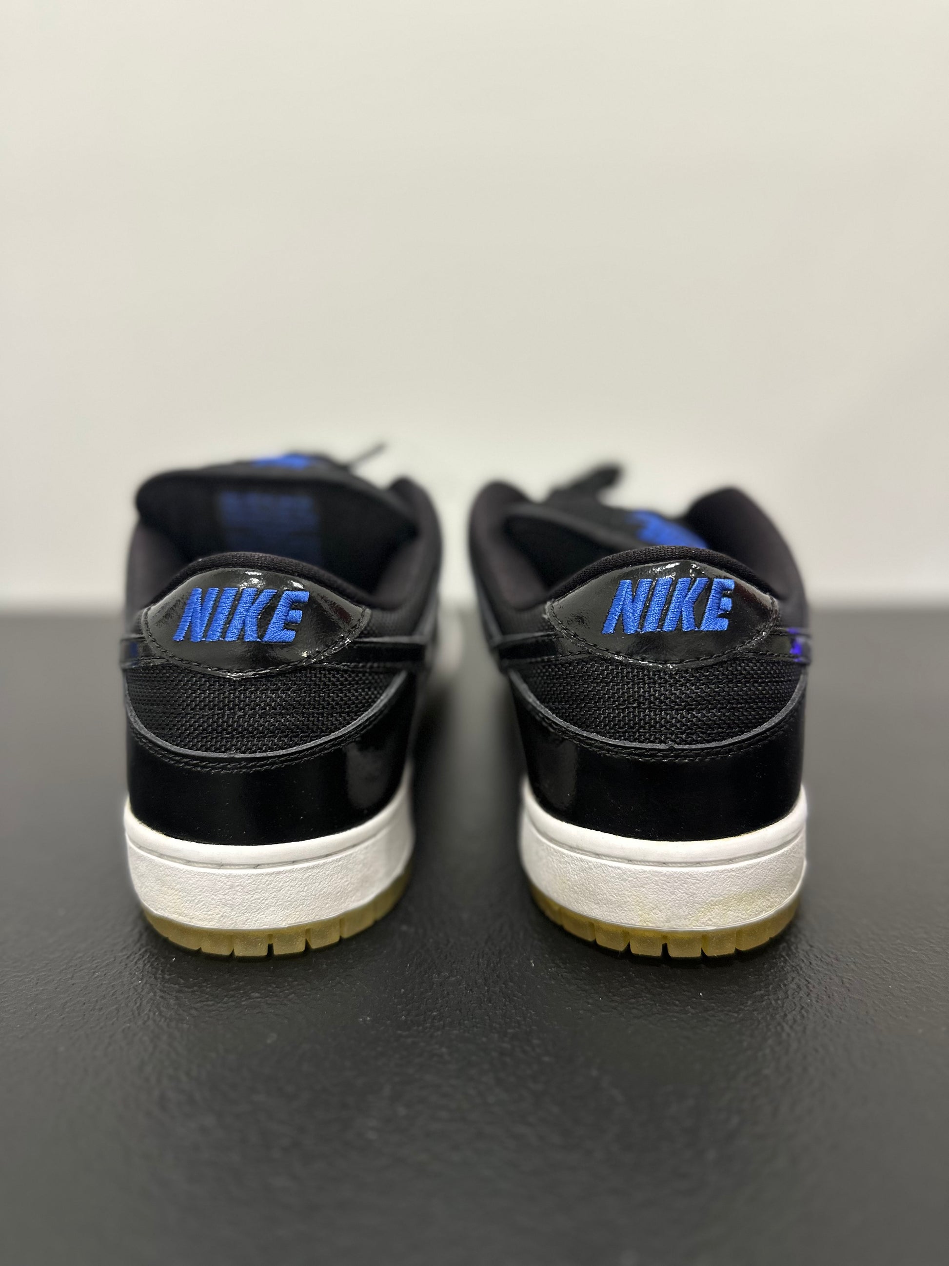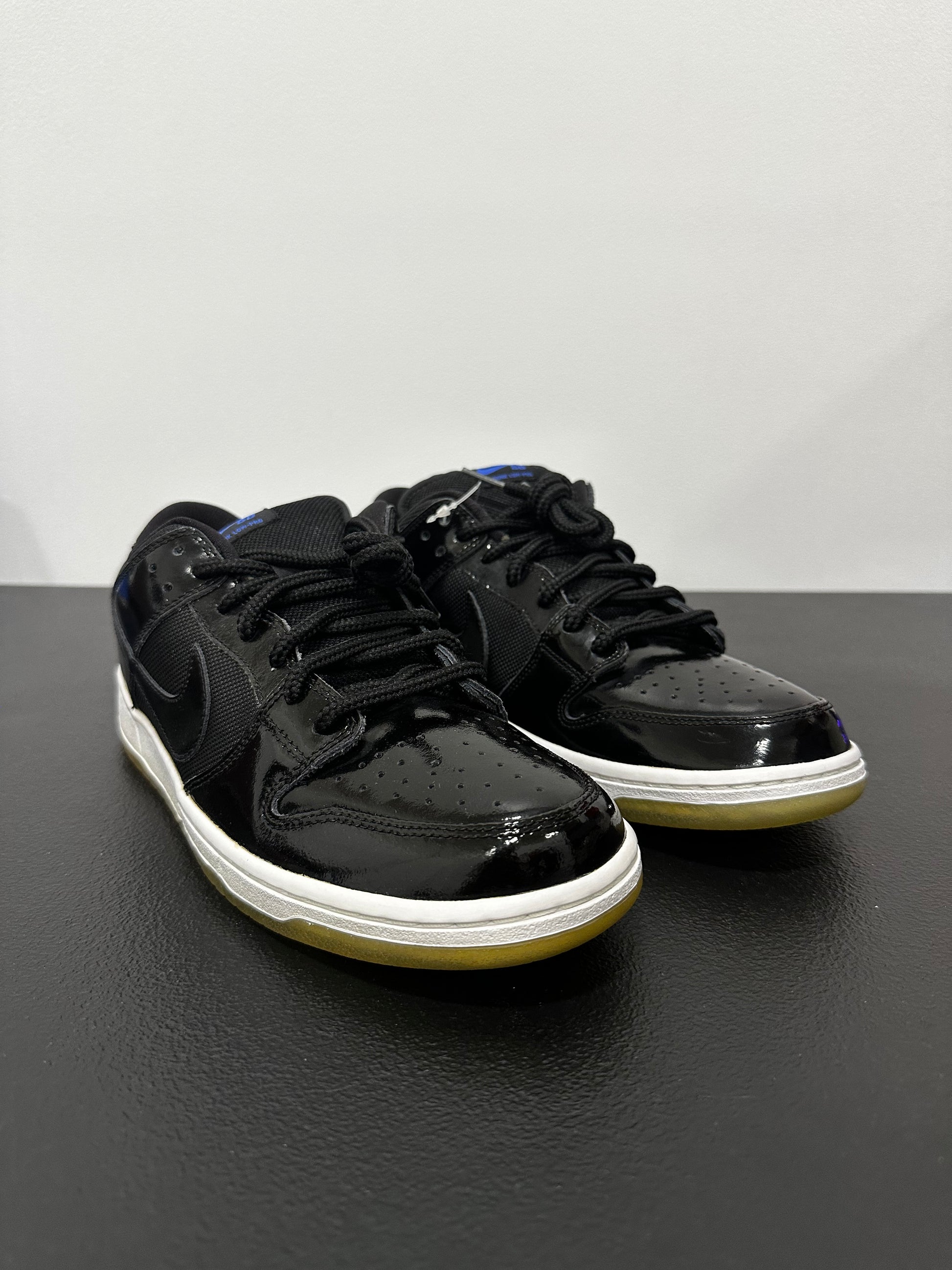 Taking inspiration from the classic Air Jordan 11, Nike SB translates an iconic high-top basketball shoe into the Dunk Low Pro SB 'Space Jam'—a low top skate shoe with patent leather and mesh textiles. Released in Summer 2011, the classic colorway features an all-black patent leather and mesh upper with bright blue branding embroidered at the tongue and heel panel. The sneaker is finished with a contrasting white midsole with a translucent outsole.